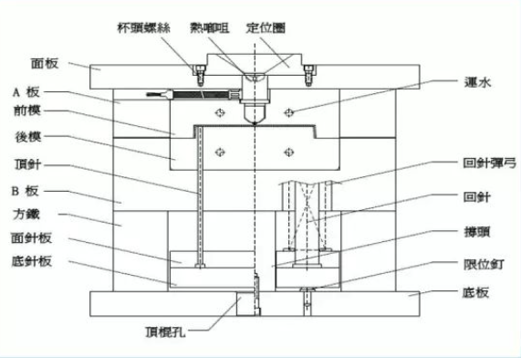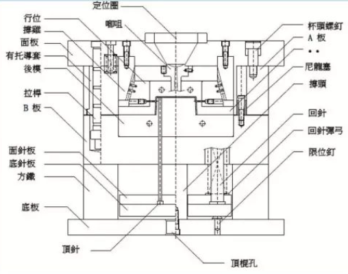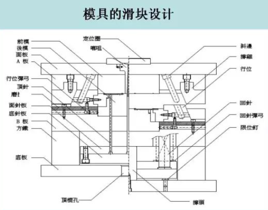 (1)膠件側壁有凹凸形狀、側孔和扣位時,模具開模頂出膠件前則須將側向型芯抽出,此機構稱行位。