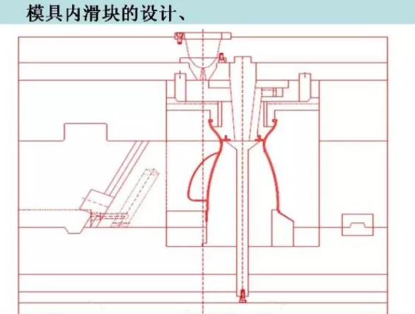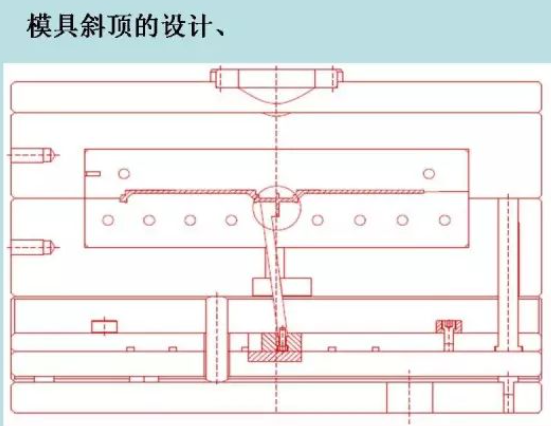 (2)膠件外側孔,需后模行位抽芯。膠件內側凹槽,若用斜頂出模,頂部開距不夠,須采用內行位利用斜向頂出,頂出和抽芯同時完成的頂出機構稱斜頂。對膠件上需抽芯的部位,當行位空間不夠時,可利用斜頂機構完成。斜頂機構中,斜向頂出距離應大于抽芯距離(B>H),防止頂出干涉。